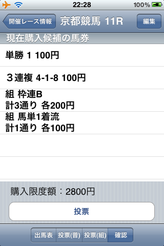 iPhone・iPod Touchでの操作に配慮した作りになっており、馬券選択から投票まで簡単に行なえます。一点買いからボックス、流し等の組合せ投票まで対応してます。